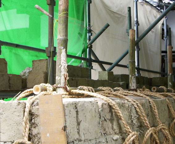 信長塀もですが、土塀の下地は本当に芸術的でかっこいい。結局見えなくなるのに日干し煉瓦を積み上げて藁縄で補強して、躯体補強は鉄筋じゃなく竹。現在新築でも、新築でも何十年後上塗り漆喰と土中塗り、大直しが落ちて日干し煉瓦が見えた時伝統工法としてまた受け継がれていくんでしょうね。これぞ伝統工法。名古屋熱田神宮の信長塀