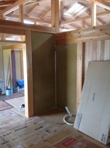 前回お邪魔させていただいた時はまだ内部荒壁塗りの最中でしたが、この度の出張で再び訪問させていただくと外部並大津(城かべ+淡路黄土)は施工完了しており、内装中塗りじまいの施工中でした。