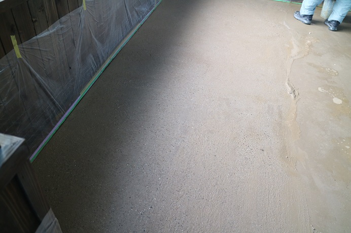 ①コンクリート下地に、前日に養生と専用下地材「ウルトラ下地材」を塗布してもらっています。
