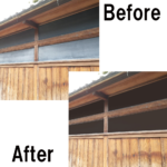 黒漆喰施工時の乾燥具合や水引き具合の違いで発生した色ムラ(一次白華)。黒漆喰の施工はうまくいったが、雨に打たれて経年変化で色ムラが発生した(二次白華)。このような黒漆喰を簡単にリペアできます。 また撥水効果もあるためリペア後、雨に打たれる箇所でも色ムラになることは無く漆喰壁を保護します。